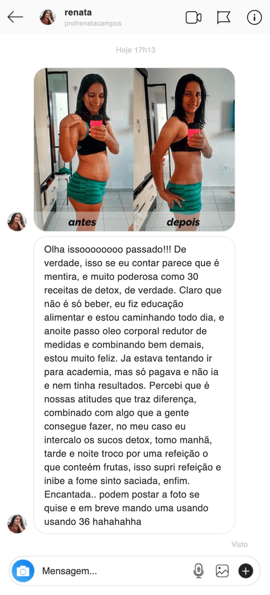 Que além de emagrecer com saúde você fará um detox profundo no seu organismo, tirando todas as impurezas. Afinal, por mais que tentamos, sempre enviamos o famoso, pé na Jaca, comemos algo que não faz bem para o nosso organismos e o detoz vai limpar isso.